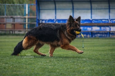 Vatra stands out as our powerhouse female! She has a remarkable champion pedigree and impressive titles as a European import. Her abilities in both working and bite work are exceptional. With her large, thick-boned frame and striking black pigmentation complemented by rich red tones, she is undeniably impressive! Beyond her remarkable skills, Vatra enjoys an active outdoor lifestyle, engaging in games of fetch during her downtime. Her puppies inherit her well-balanced traits, displaying loyalty, obedience, protectiveness, playfulness, and an abundance of love. They are not only excellent candidates for show and training, but also make fantastic family pets; embodying the best characteristics of their mother.